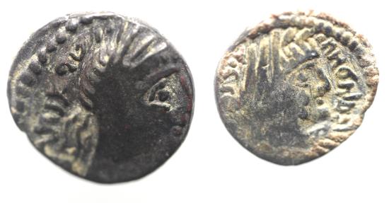 Arabia. Nabataean Kings. Malichus II (AD 40-70). AR sela (15mm, 3.35g). Petra mint. Dated regnal year 10 or 11 (AD 49/50 or 50/51). Laureate bust of Malichus II r.; Nabataean Aramaic date to l. / Veiled bust of Suqailat r. Barkay 199 or 200; Meshorer 132 (year 11).