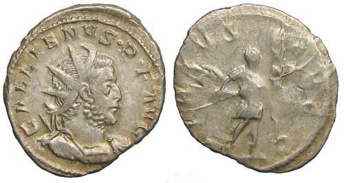 Reverse: VIRTVS AVGG, Gallienus in military attire, standing right, holding spear and standard.