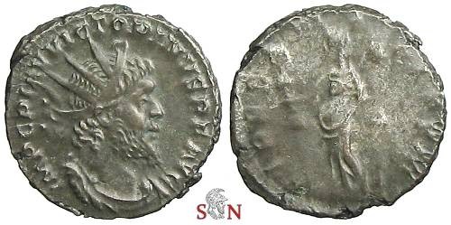 | Victorinus Antoninianus, 2. emission, Mint I. 4,07g, 19mm.� Obv: IMP C PIAV VICTORINUVS P F AVG, radiate and cuirassed bust right. Rev: FIDES MILITVM, Fides standing left, holding two standards. AGK 5b, Cunetio 2522, Elmer 654 |