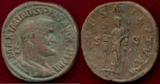 overall good eye appeal Rome AE sestertius 32mm, 20.7 grams O:Bust Maximinus right R:Fides Militum SC, Fides left with military trophies in both hands