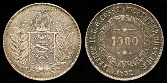 1852 Brazil 1000 Reis - Petrus II - AU Silver