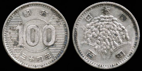 1959 Japan 100 Yen (Y78) AU. Silver, spotty toning.