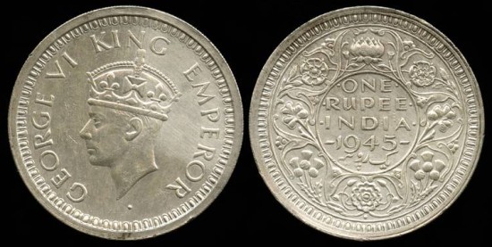 1945 B India (British) 1 Rupee (KM-557.1 -- small 5) UNC, Silver. Hairlines from a harsh cleaning but still nice coin.