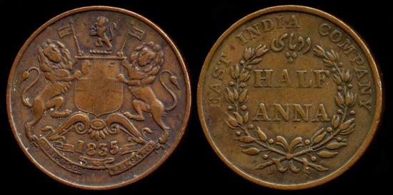 1835 (b) India (British) 1/2 Anna (KM-447.1) AU.