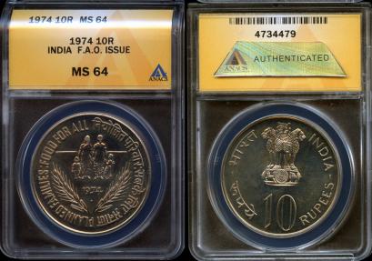 1974 (b) India - Republic 10 Rupee (KM-189) - F.A.O. Issue - ANACS MS64. Small mintage of only 65,000 pieces.