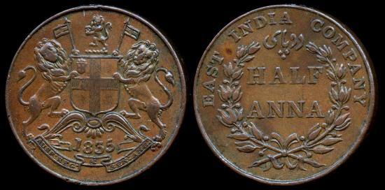 1835 (b) India (British) 1/2 Anna (KM-447.1) AU.