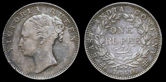 1840 India (British) 1 Rupee (KM-457.3 -- 19 berries) XF, Silver. Light attractive tone on rims. A couple of very tiny cuts on edge of rim.