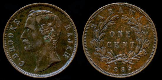 1885 Sarawak 1 Cent (KM-6) AU. Scarce, attractive dark-chocolate brown.