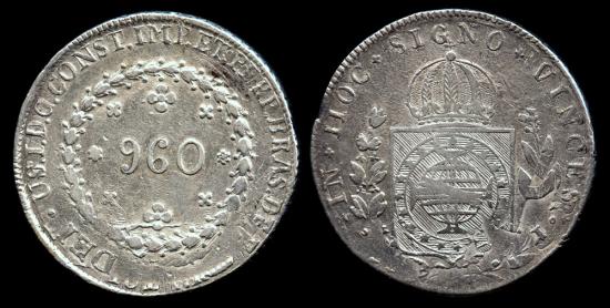 1823 R Brazil 960 Reis (KM-368.1 -- Pedro I), AU, Silver. Remmants of host coin are clearly visible. Nice!
