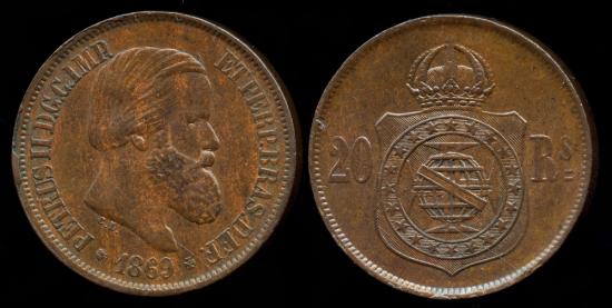 1869 Brazil 20 Reis (KM-474) UNC. Nice chocolate-brown color.