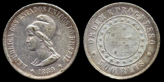 1889 Brazil 500 Reis (KM-494) XF, Silver.