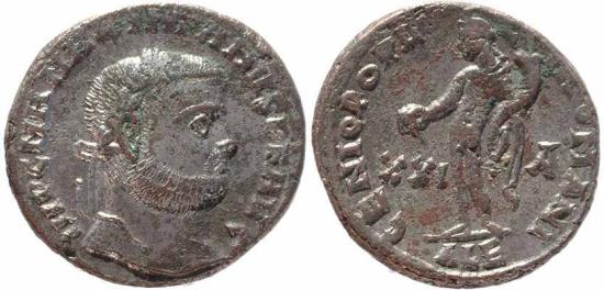 Maximianus silvered follis. Minted: Alexandria 300AD Size: 27mm Weight: 10.52 grams Obverse: IMP C M A MAXIMIANVS P F AVG, laureate bust right Reverse: GENIO POPVLI ROMANI, Genius standing left, modius on head, naked except for chlamys over left shoulder, holding patera and cornucopiae; A in right field, XXI in left; ALE in ex |