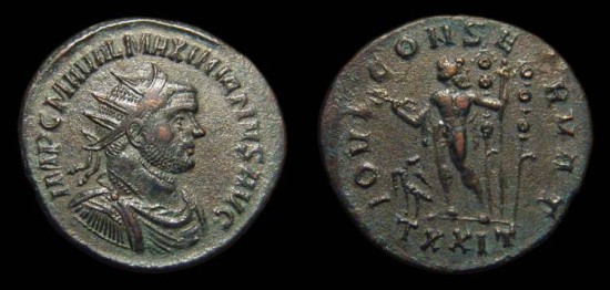 | Imperial Rome, Maximianus. AD 286 - 305. Antoninianus, AD 290-1. Ticinum. 3rd Officina. 23mm. 3.70g. IMP C M A VAL MAXIMIANVS AVG, his radiate and cuirassed bust rt. / IOVI CONSERVAT, Jupiter standing lt., holding a thunderbolt and sceptre, eagle at his feet, two standard behind, TXXIT in ex. RIC 560. Nice VF with pleasing style. |