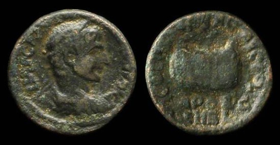Gallienus. AE 27 of Heliopolis, Coele Syria. 259-268 AD. obv: IMP CAES P LIC GALLIENVS AVG, laureate cuirassed bust right. rev: COL IVL AVG FEL HEL, prize money purse, CERT SACR above. CAP OECV / ISE HEL below. 26 mm; 12.8 g. BMC 30. A neat coin with deep olive green patina.