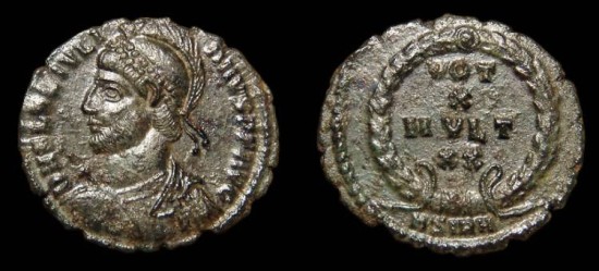 Imperial Rome, Julian II. AD 360 - 363. AE-3. Sirmium. 2.51g. 12h. 21mm. DN FL CL IVLIANVS PP AVG, his helmeted and cuirassed bust lt., holding shield and spear. / VOT V MVLT X within a lauel-wreath, ASIRM in ex. RIC 108. Nice EF with a detailed portrait of this great Roman emperor who tried to restore the proper Roman traditions and unfortunately died before he could succeed.