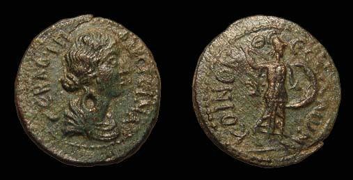 Koinon Thessalonica. Faustina Jr., the wife of Marcus Aurelius. Augusta AD 164 - 175/6. AE-21. 6.93g. 21mm. Her draped bust rt. / Athena advancing rt., brandishing a spear and holding a shield. BMC p.201, 80B. Nice VF and scarce.