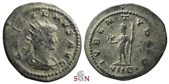 Gallienus Antoninianus, struck AD 266-267 at Antiochia mint. Obv: GALLIENVS AVG, radiate and draped bust right. Rev: IVBENTVS AVG / VIIC (in exergue), Gallienus in military attire standing left, upright spear in left hand, Victory in right hand. 3,54 g, 23 mm. Goebl 1641a, RIC 615 scarce |