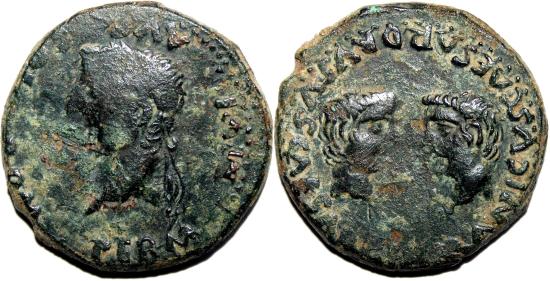 Very scarce coin, conserving complete legends in both sides: very, very difficult to find in this issue. Superb busts of the Caesars Germanicus and Drusus. Excellent dark green patina. VF/VF+.