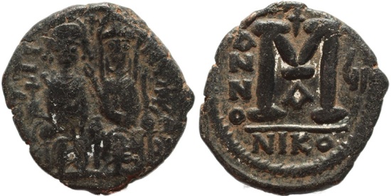 Justin II & Sophia Minted: Nicomedia mint. Size: 28mm Weight: 12.38 grams Obverse: D N IVSTINVS P P AVG, Justin on left, Sophia on right, seated facing on double-throne, both nimbate, Justin holding cross on globe, Sophia holding sceptre Reverse: large M, ANNO to left, cross above, regnal year to right, officina letter below, mintmark NIKO. SB 369 |