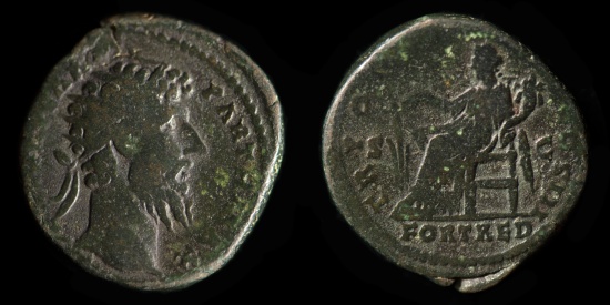 Lucius Verus (161-169 A.D.) Æ Dupondius, approx. 25 mm, 12.48 g. Rome mint, (168 A.D.) Obv: L VERVS AVG PARTH MAX, radiate head of Verus right Rev: FORT RED [in exergue] / TR POT VIII IMP V COS III / S [-] C, Fortuna seated left, holding a rudder & cornucopiae F, good surfaces, dark green patina cf: RIC (Aurelius) 1477, Cohen 104 |