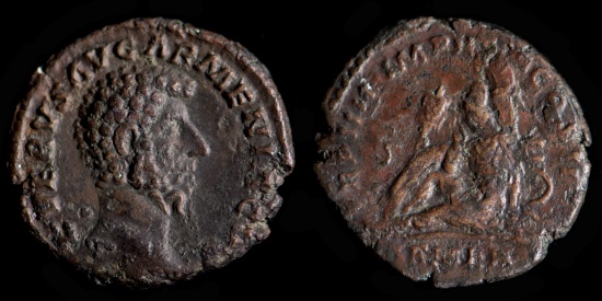 Lucius Verus (161-169 A.D.) Æ As, approx. 25 x 26 mm, 8.66 g. Rome mint, (163-164 A.D.) Obv: L VERVS AVG ARMENIACVS, bare headed bust of Verus right Rev: ARMEN [in exergue] / TR P IIII IMP II COS II / S [-] C, Armenia seated left, hand upon shields, standards & shield before her & a trophy and shield behind Near EF, dark patina, some roughness on the reverse. Excellent portrait. cf: RIC (Aurelius) 1364, Cohen 9 |