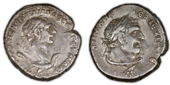 SYRIA, SELEUCIS AND PIERIA, ANTIOCHIA AD ORONTEM Trajan (98 – 117 A.D.) AR Tetradrachm, approx. 25 mm, 14.40 g, 6 h. Tyre (?) mint Dated TR POT XV & COS V (111 A.D.) Obv: AYTOKP KAIC NEP TPAIANOC CEB ΓEPM ∆AK, laureate bust of Trajan right, above eagle standing right, a club in the field below Rev: ∆HMAPX EΞ YΠAT E, bust of Melquart-Hercules, a lion skin draped over his shoulders, knotted in front VF cf. RPC III, 3539, Prieur 1515, McAlee 460 |
