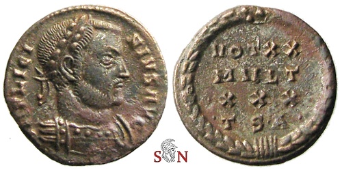 Licinius I. Follis, struck AD 318-319 at Thessalonica mint.