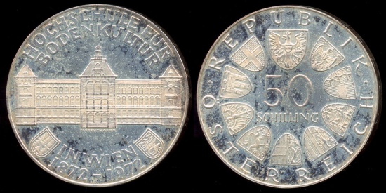 1972 Austria 50 Schilling (KM-2914) - 100th Anniversary - Institute of Agriculture Silver Commemorative - Proof, lightly toned. Looks better in hand than in the picture.