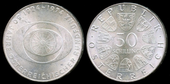 1974 Austria 50 Schilling (KM-2922) - 50th Anniversary of Austrian Broadcasting Silver Commemorative BU. A scarce issue that is getting harder to find.