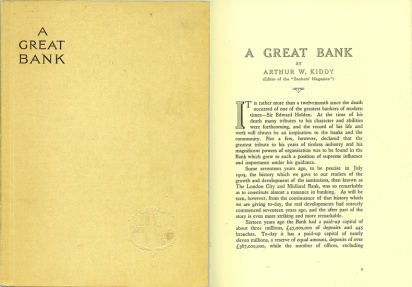 A Great Bank: London Joint City and Midland Bank Limited by Arthur W. Kiddy. A very hard-to-find book. Reprinted from the "Bankers Magazine" October 1920 with additional photographic reproductions. Compliments card found within from the Chairman and Joint Managing Directors.
