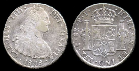 1808 PJ - PTS Bolivia 8 Reales (KM-73 -- Carolus IIII) AU, silver. Very nice attractive coin. Choice!