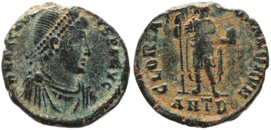 Reverse: GLORIA ROMANORVM, Emperor standing facing, head right, holding standard and globe , ANTB in ex
