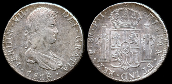 1818 PJ-PTS Bolivia 8 Reales (KM-84 Ferdinand VII) XF, Silver. Pretty close to AU as the fields have lots of luster. light tinges of tone on the rims. An attractive coin.