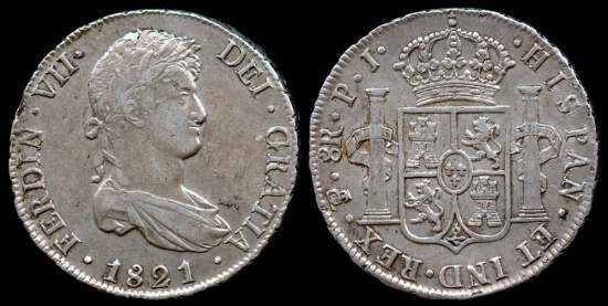 1821 PJ-PTS Bolivia 8 Reales (KM-84 Ferdinand VII) AU, Silver. Nice bold portrait with light tinges of tone around the rims. An attractive coin!