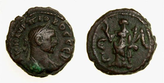 Rev: Homonia standing left, right arm outstretched, holding double cornucopiae in left hand