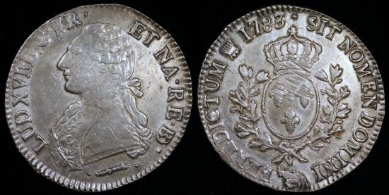1783 (p) France 1 Ecu (KM-572) Cow mintmark, Issued for Providence of Beam - Louis XVI - AU, Silver. Light original tone with just some very light wear on the high points. A choice Ecu!