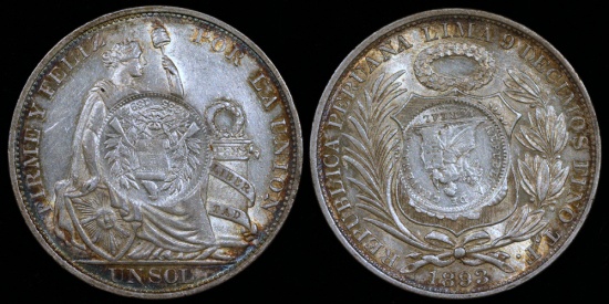 1894 Guatemala Peso – ½ Real Counterstamp on Peru 1893 T. F. Sol (KM224). UNC, Silver, Gorgeous multicolored rim toning. A choice example of this type coin.