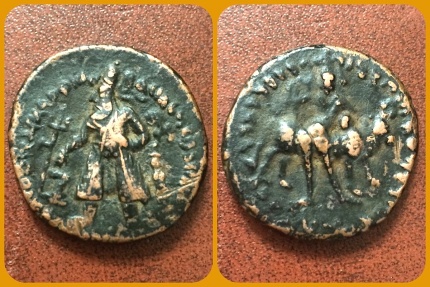 India Kushans, Vima Kadphises. Circa 90-100 AD. Æ Tetradrachm 27.85mm, 17.25gm. Vima Kadphises standing facing, head left, sacrificing over altar;