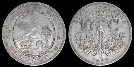 1936 Bolivia 10 Centavo (KM-179.1) XF.