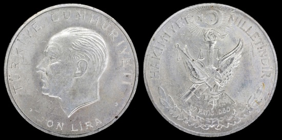 1960 Turkey 10 Lira KM-894) UNC, silver. Much nicer in hand as it was difficult to photograph.