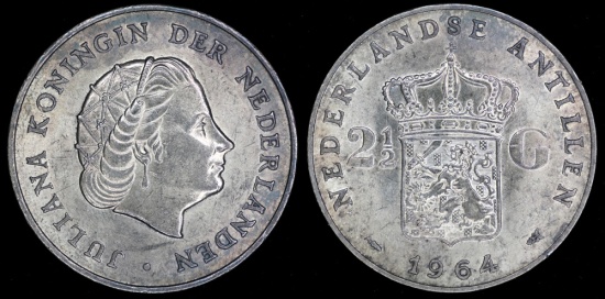 1964 Netherlands Antilles 2-1/2 Gulden (KM-7) AU, silver. Light attractive toning.
