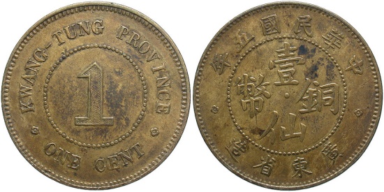 China, Kwangtung. 1916. 1 cent (6.56 g). KM Y-417. EF.