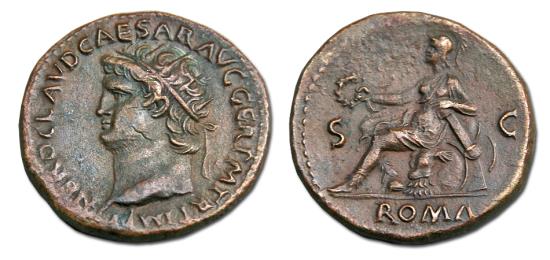 Nero. AD 54-68. Æ Dupondius (29 mm, 14.6 g). Rome mint. Struck circa AD 65. NERO CLAVD CAESAR AVG GER P M TR P IMP P P, radiate bust left. S-C across fields, Roma seated left on cuirass, holding wreath and parazonium; various arms around. RIC I 297; WCN 227. Good VF, brown patina.