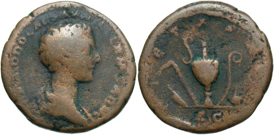 Commodus. As Caesar, A.D. 166-177. Æ as (25 mm, 8.74 g, 12 h). Rome, under Maruc Aurelius, ca. A.D. 176/7. Bare-headed and draped bust of Commodus right / Knife, aspergillum, jug, lituus, and simpulum. RIC 1539. Fine, brown patina. |
