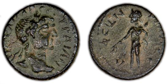 CILICIA, PHILADELPHIA Trajan (98 – 117 A.D.) Æ, approx. 18 mm, 3.93 g, 8 h Obv: ΤΡΑΙΑΝΟΣ ΚΑΙΣΑΡ ΣΕ, laureate bust of Trajan right Rev: ΦΙΛΑΔΕΛΦΕΩΝ, Apollo standing left, holding palm branch and quiver over shoulder cf. RPC III, 3213, SNG Levante 576 (same dies); SNG France - Nice VF, green & earthen patina, strong detail |