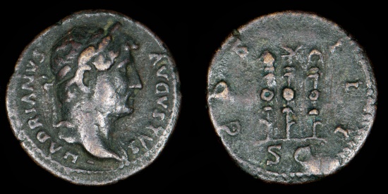 Hadrian (117 – 138 A.D.) Æ Quadrans, approx. 18.5 mm, 3.30 g. Rome mint (125 – 128 A.D.) Obv: HADRIANVS AVGVSTVS, laureate head of Hadrian right, drapery on far shoulder Rev: COS III / S [-] C, three standards Near VF cf. RIC 689 (“S”) var (drapery on shoulder) |