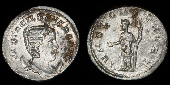 Otacilia Severa (Augusta, 244 – 249 A.D.) AR Antoninianus, approx. 22 mm, 3.98 g. Antioch (?) mint (ca. 246 – 248 A.D.) Obv: M OTACIL SEVERA AVG, draped bust of Otacilia Severa right, wearing stephane, resting atop a crescent Rev: IVNO CONSERVAT, Juno, veiled, standing left, holding patera and scepter. EF, sharply detailed portrait, a few deposits, slight porosity cf. RIC (Philip I) 127; RSC 20 |