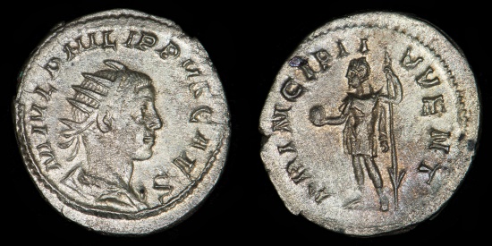 Philip II (247 – 249 A.D.) AR Antoninianus, approx. 22 mm, 3.64 g. Rome mint, 3rd officina, 5th emission (246 A.D.) Obv: M IVL PHILIPPVS CAES, radiate, draped cuirassed bust of Philip right Rev: PRINCIPI IVVENT, Philip II standing left, holding globe and globe and transverse spear EF, slight overall porosity cf. RIC (Philip I) 218d; RSC 48 |