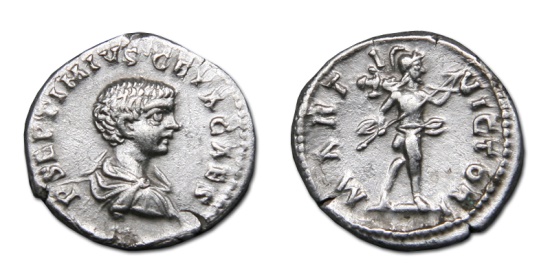 Geta AR Denarius. 203 AD, Laodicea ad Mare mint (19 mm, 3.5 g). P SEPTIMIVS GETA CAES, draped bust right. MARTI VICTORI, Mars advancing right, holding spear & trophy. RIC 103, RSC 76. VF. |