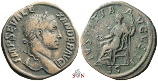Severus Alexander Sestertius, struck AD 230 at Rome mint. Obv: IMP SEV ALEXANDER AVG, laureate head right. Rev: IVSTITIA AVGVSTI / SC (in exergue), Justitia seated left, holdig patera and sceptre. 20,74 g, 30 mm. RIC 563 b |